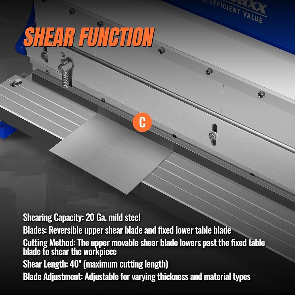 Shearing Power: Shear capacity of 20 Ga. mild steel with a 40" maximum cutting length, equipped with reversible upper shear blades and adjustable blade settings for different materials.