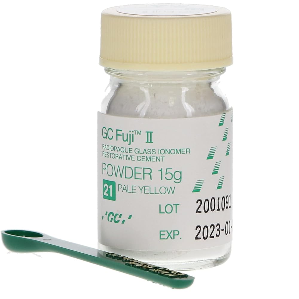 GC Fuji II - #21 Pale Yellow, 15 g Powder Bottle Refill. Fluoride-Releasing, Radiopaque, Self-Cure Glass Ionomer.