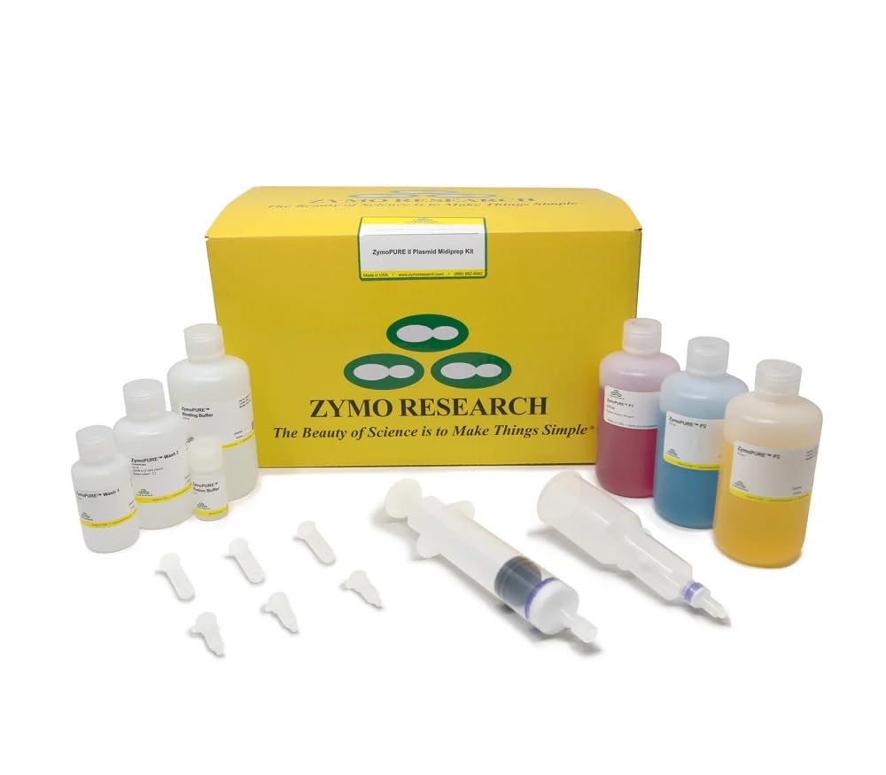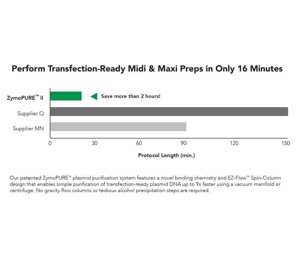 Part of the ZymoPURE Plasmid Kits collection, the ZymoPURE II Plasmid Midiprep kit provides the fastest and simplest method available to efficiently isolate up to 1.2 mg of transfection grade plasmid DNA from E. coli. Utilizing a modified alkaline lysis in conjunction with a patented binding system, the ZymoPURE II Midiprep kit can process up to 50 ml of culture in less than 18 minutes. This remarkable kit results in significantly more plasmid DNA while providing drastically reduced processing times. The plasmid DNA is rapidly bound onto a column with either a vacuum or a centrifuge instead of a slow gravity flow column. Additionally, there is no alcohol precipitation step required and the elution is performed using a microcentrifuge. The recovered plasmid DNA is highly concentrated (up to 6 µg/µl), endotoxin-free and transfection-ready. As an added convenience, the ZymoPURE II Plasmid Midiprep kit contains colored buffers that permit error-free visualization and identification of complete bacterial cell lysis and neutralization.