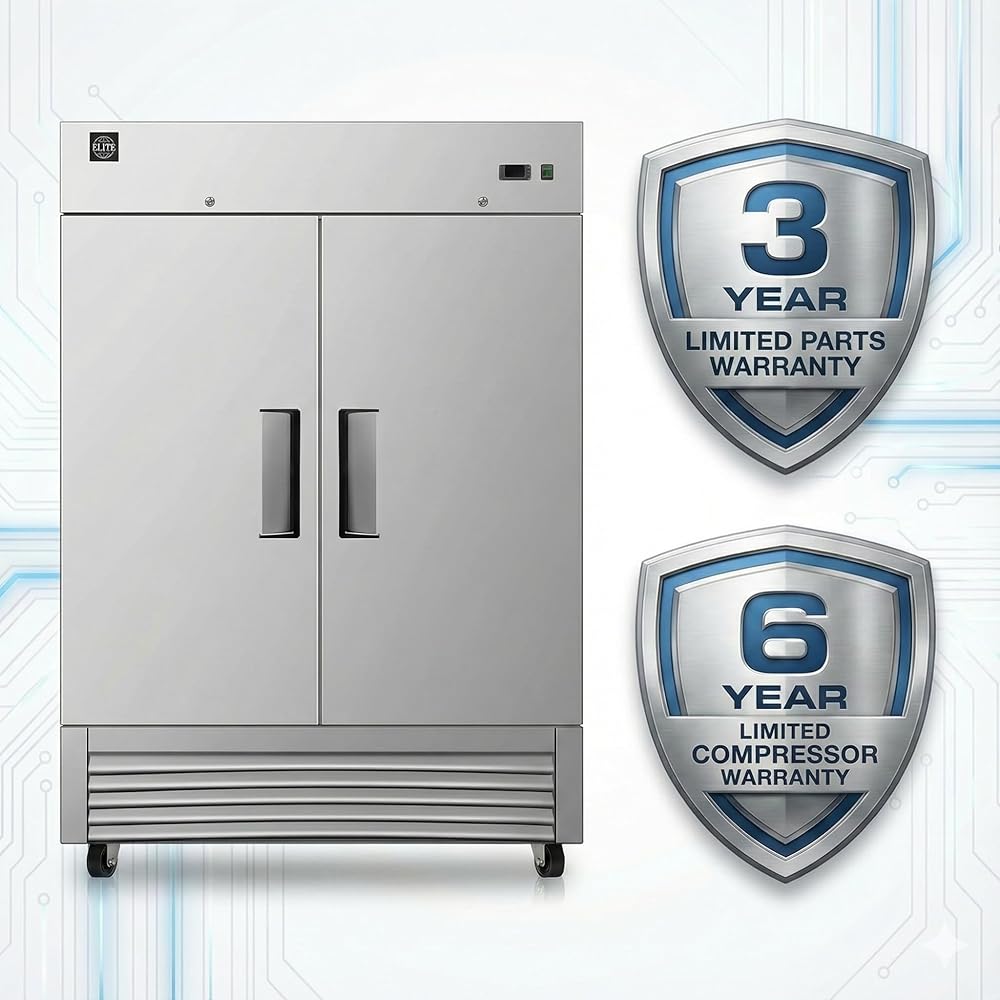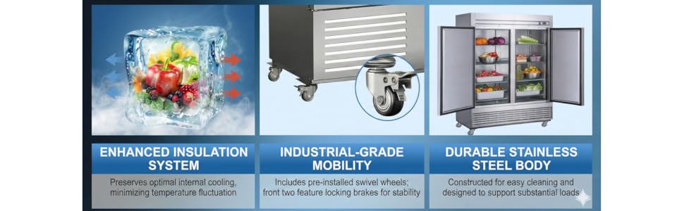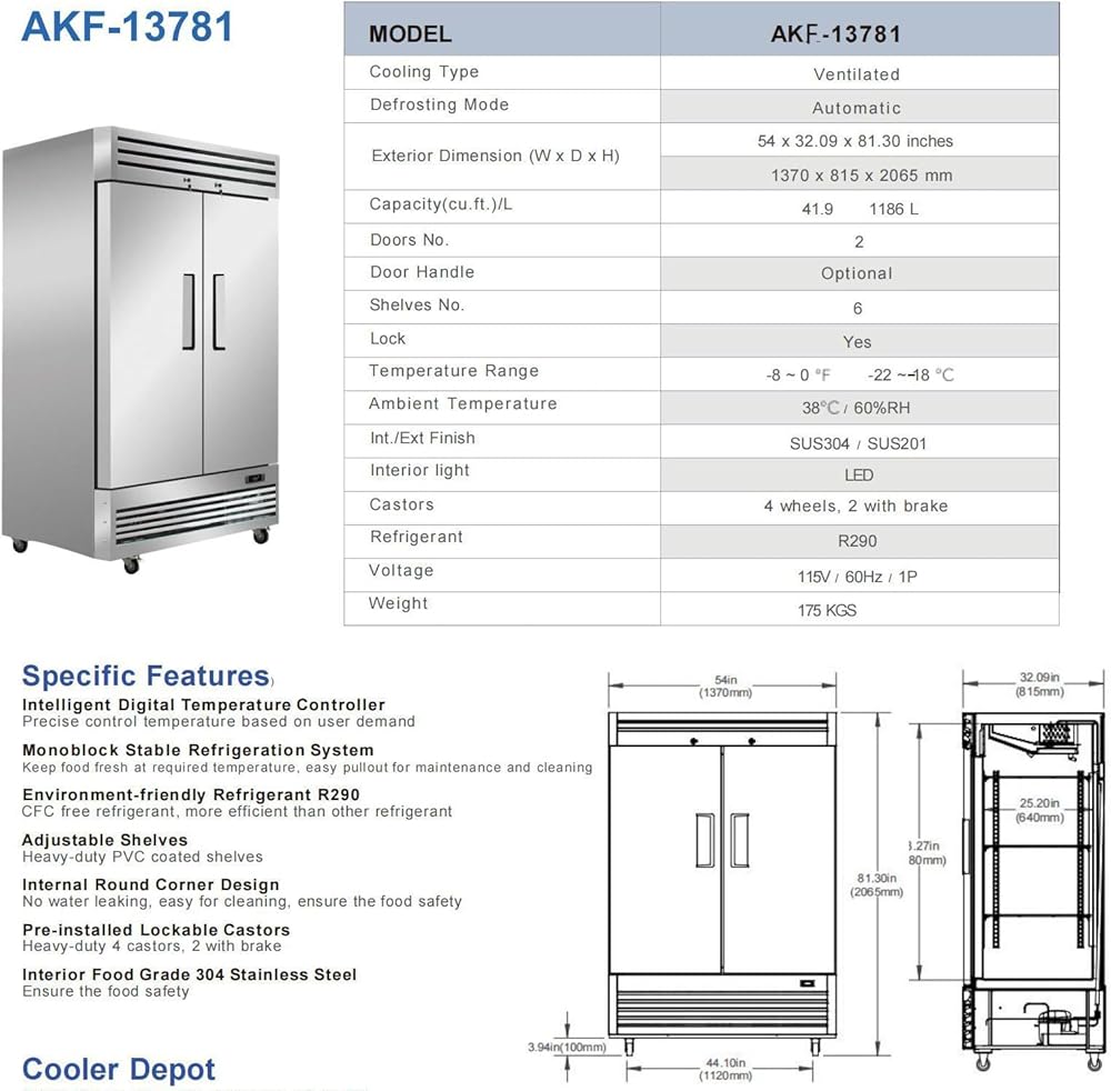 This NSF Certified Commercial Reach-In freezer has spacious dimensions of 54"X32"X82", Its capacity is 47 Cu.ft. Crafted with high quality 430 and 304 Stainless steel, this item will keep all your kitchen ingredients cooler and fresher. The led lights included will help you keep track of inventory.
