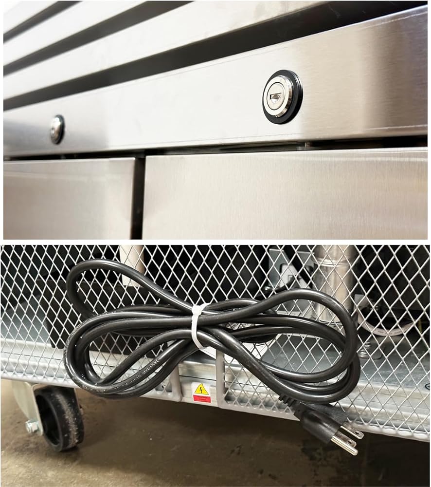 Material: Designed with self closing solid stainless steel door, this unit is easy to clean and will withstand heavy-duty restaurant tasks. It also has 4 lockable castor wheels to help move around, and 6 heavy duty PVC coated shelves increase practical usage, easy to slide in and out, clean and maintain.