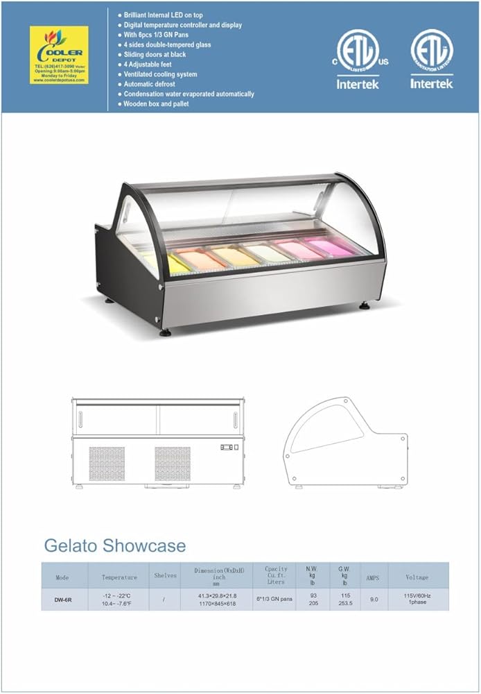 Gelato Freezer Display Case Dipping Cabinet NSF Certified Pan Ice cream Countertop Black Frame 6 Pan DW6R
