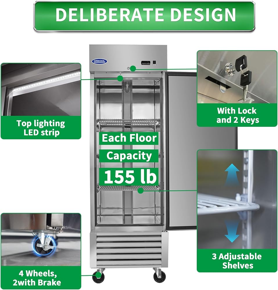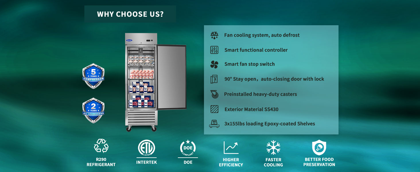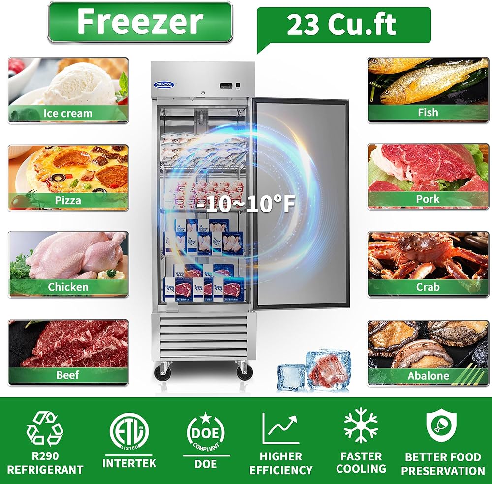 Commercial-Grade Storage Capacity - The 23 cu.ft organized interior provides ample space for commercial frozen goods storage, featuring 3 shelves (155lb capacity each). The pre-coated aluminum interior with rounded corners ensures easy cleaning and optimal space utilization