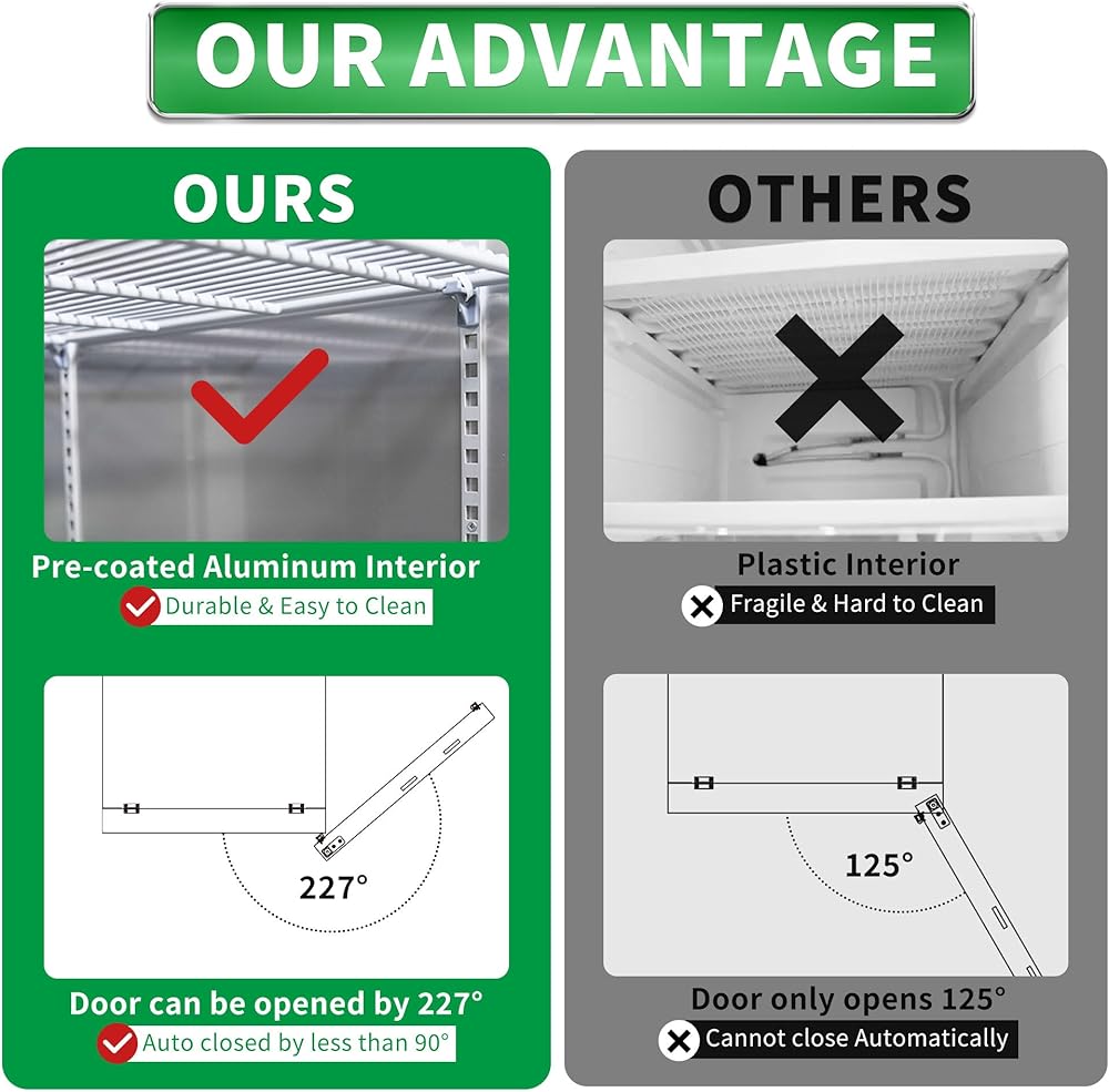 Professional Configuration & Warranty - The 227° wide-opening door (auto-closes when angled below 90°) provides flexible access in tight spaces. Backed by a 5-year compressor warranty and 2-year full coverage, with 24/7 technical support from US-based warehouses
