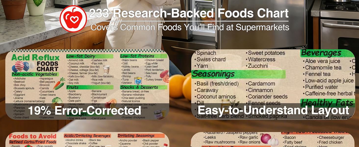 Highly Informative Content: With 238 researched food items, this alkaline acid food chart poster serves as a comprehensive acid reflux diet guide for daily meal preparation and shopping.