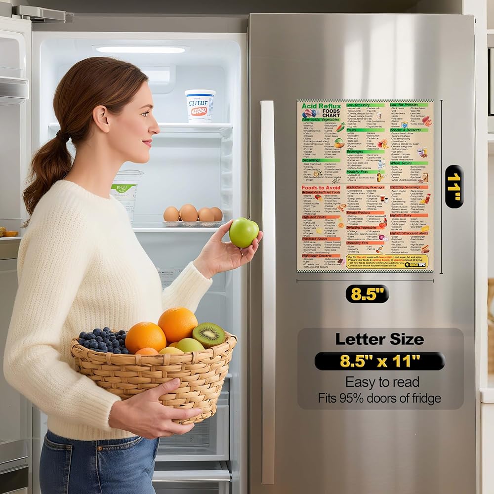Large Size for Easy Reference: Featuring a standard 8.5x11 inches layout, this acid reflux poster fits most fridge doors and presents a clear GERD food list for quick, at-a-glance reference.