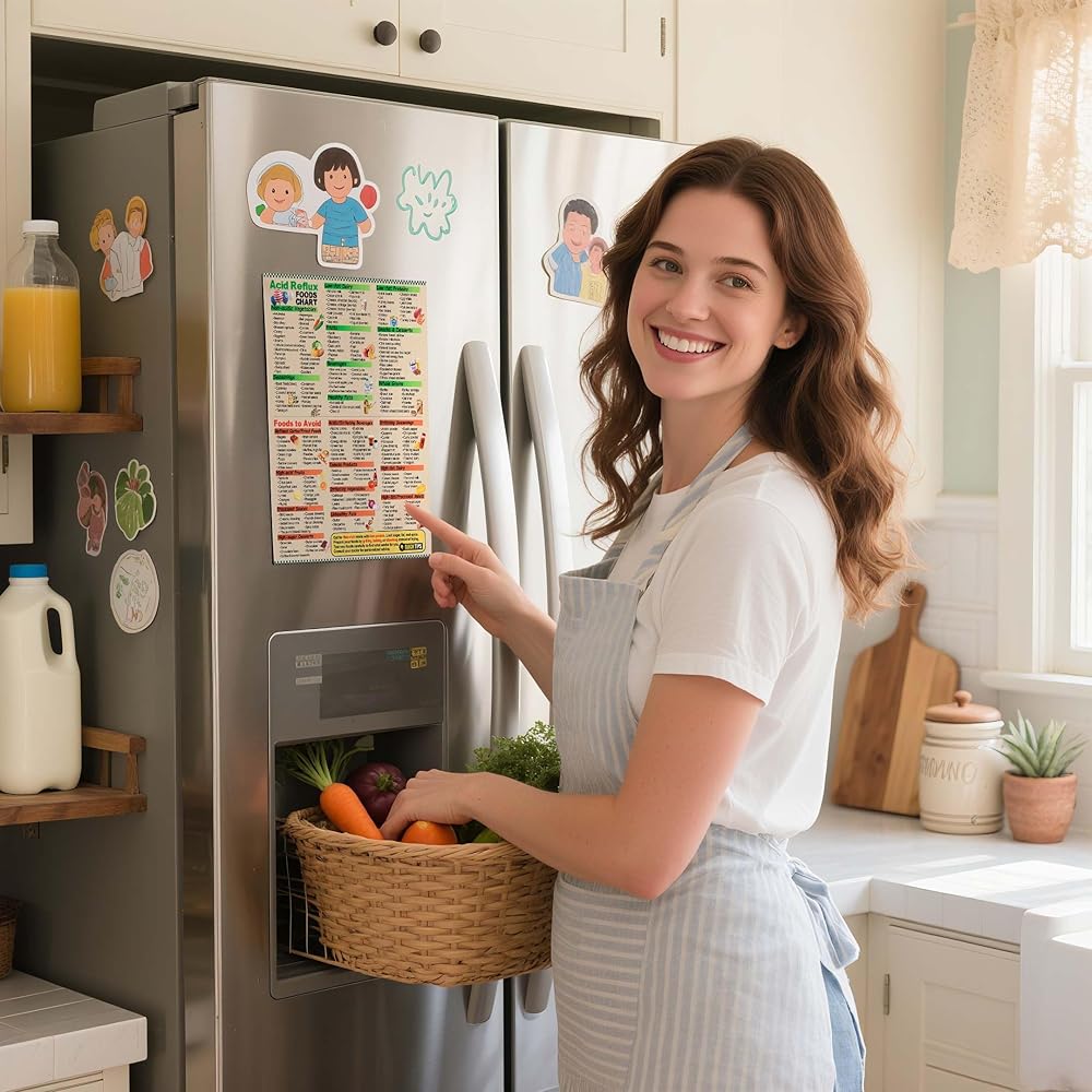 Handy Fridge Magnet: This sturdy Acid Reflux Cheat Sheet Magnet stays firmly in place, streamlining meal planning and grocery list creation for an effortless acid reflux diet management.