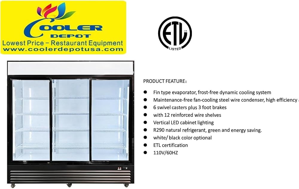 This Commercial refrigerator has 3 Slide Glass doors. The dimension is 72 in Length X 28 in Depth X 81 Height, Its capacity is 57 Cu.ft. Crafted with high quality temperature insulation material, this item will keep all your kitchen ingredients cooler and fresher. The led lights included will help you keep track of inventory easily.