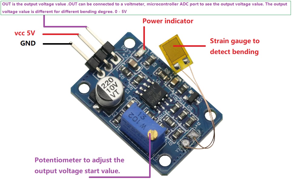 This is bend sensor Detecting principle is also, bending degree of conversion, the strain gauge on the carrier, such as: iron and aluminum plastic sheet Then bend the carrier, bending strain gauge detected output voltage will change.