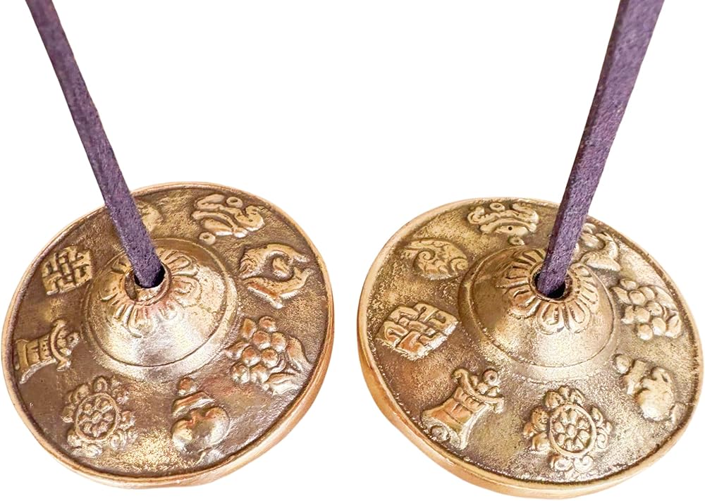 Discover inner peace and harmony with these authentic Tibetan Tingsha cymbals. Measuring 2.6 inches in diameter, these traditional meditation bells produce crisp, clear tones that can enhance your meditation practice or create sacred space. Crafted from bronze with intricate Tibetan script engravings, each pair includes a black cord connecting the two cymbals and comes with a drawstring bag for safe storage. The cymbals feature a beautiful floral design in the center surrounded by traditional symbols. These meditation chimes are perfect for marking the beginning and end of meditation sessions, energy clearing, sound healing, or adding ceremonial elements to yoga practice. The substantial weight and traditional construction ensure pure, sustained resonance when struck together. These versatile instruments can be used for personal practice or group settings where their penetrating sound can effectively center attention and create atmosphere.