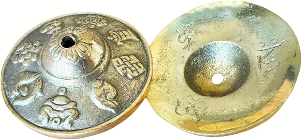 AUTHENTIC DESIGN: Traditional Tibetan meditation cymbals crafted from bronze with intricate Sanskrit symbols and floral patterns