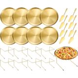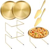 12 Pcs Pizza Pan Riser Stand Set, 4 Metal Pizza Table Stands + 4 Nonstick Pizza Pans + 4 Pie Servers, Gold Pizza Rack & Tray for Baking, Dessert, Cheese, Party, and Restaurant Use