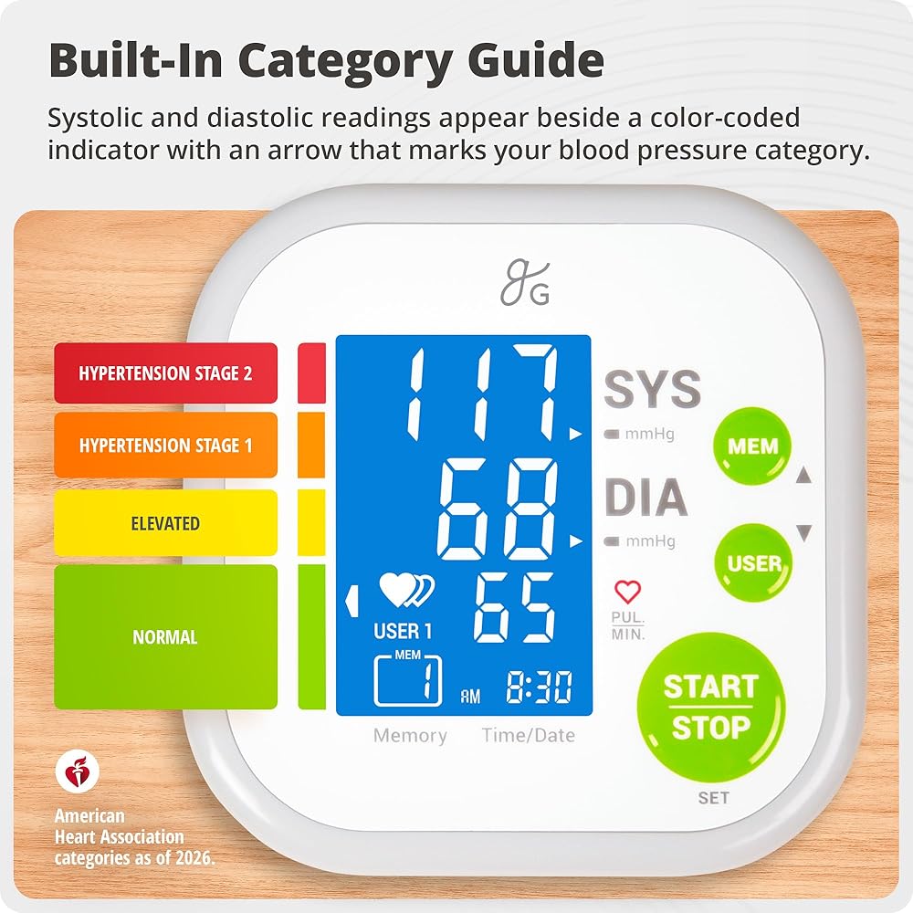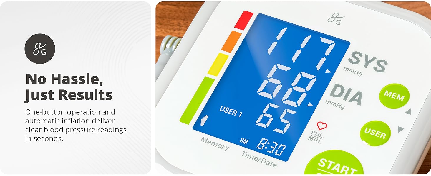 Greater Goods Upper Arm Blood Pressure Monitor for Home Use – Automatic One-Touch BP Machine, Wide-Range Cuff (8.7"–16.5"), Large Backlit Display, 2-User Memory, Complete Kit