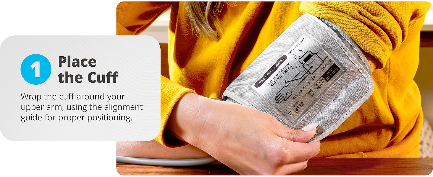 Upper Arm Cuff with Alignment Guide: The adjustable cuff fits arm circumferences 8.75–16.5 in (22–42 cm) and features a printed artery alignment marker for correct positioning. Measuring your upper arm beforehand helps confirm compatibility and ensure accurate readings.