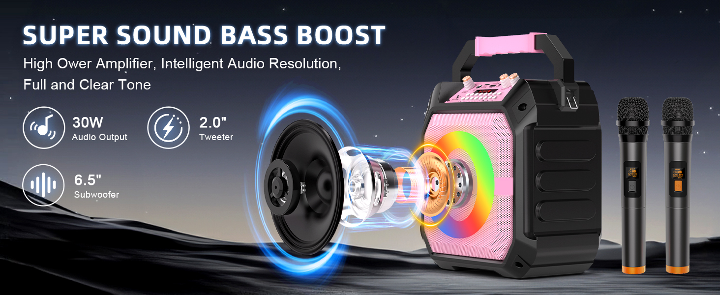 Karaoke Machine with 2 Wireless Microphones, Portable Bluetooth Speaker with RGB Strobe Lights, PA System Supports TWS/USB/TF/REC/AUX, Karaoke Speaker for Adults & Kids, Pink