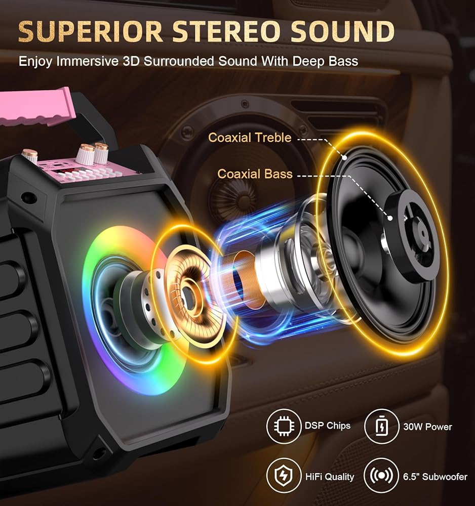 Superb HD Stereo Sound Quality: This portable Bluetooth speaker features a high-performance audio driver paired with an advanced digital signal processor (DSP) to deliver clearer sound, deeper bass, and balanced volume with minimal distortion or noise. Equipped with a powerful 6.5-inch full-range speaker, this karaoke machine amplifies your voice effortlessly, plays music or radio smoothly, and maintains clean, rich sound even at higher volumes. Enjoy strong, punchy bass and crisp, transparent treble for an immersive karaoke experience.