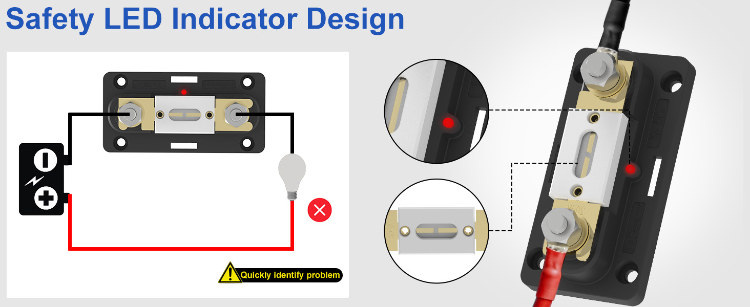 【Blown-Fuse Indicator】—— Built-in prominent red indicator light instantly illuminates when the fuse blows, allowing quick fault identification without opening the cover for efficient and visual circuit troubleshooting