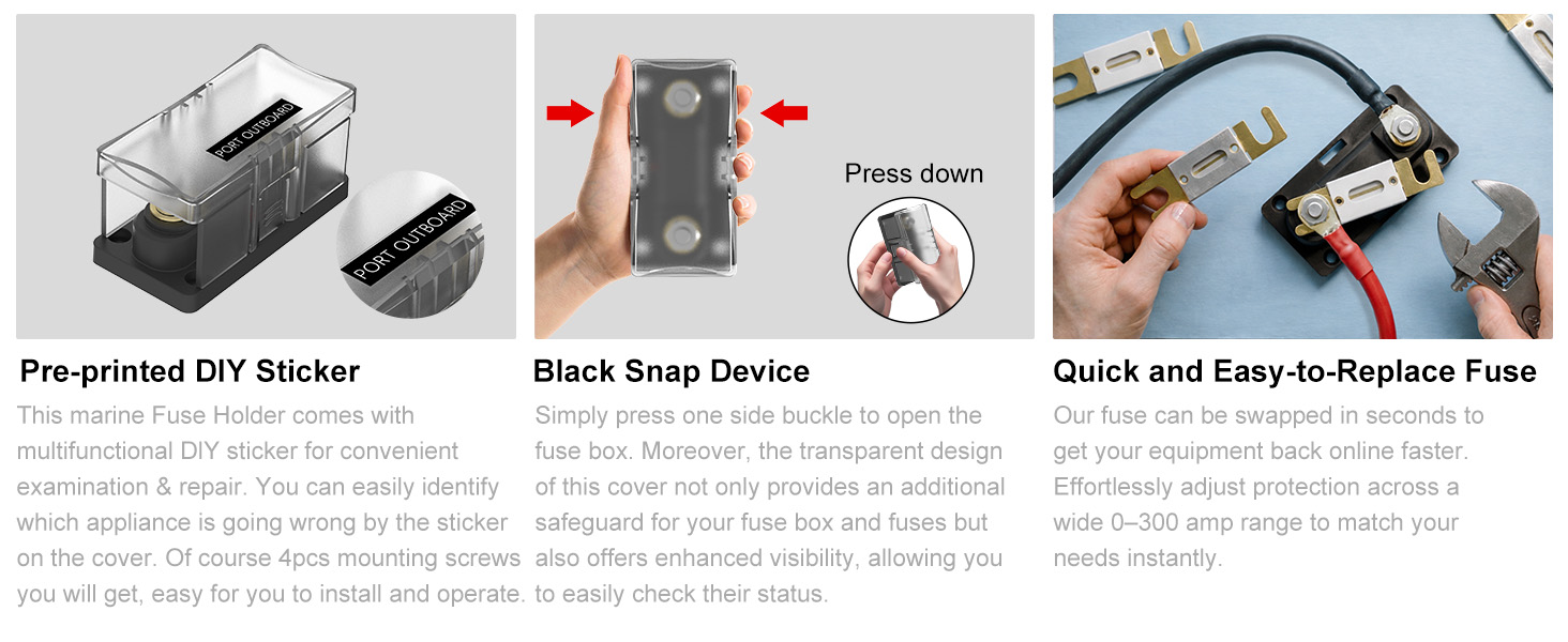 【Easy Installation】—— Includes mounting screws and positioning stickers, transparent cover allows real-time internal inspection, and the snap-on design makes installation and fuse replacement quick and straightforward