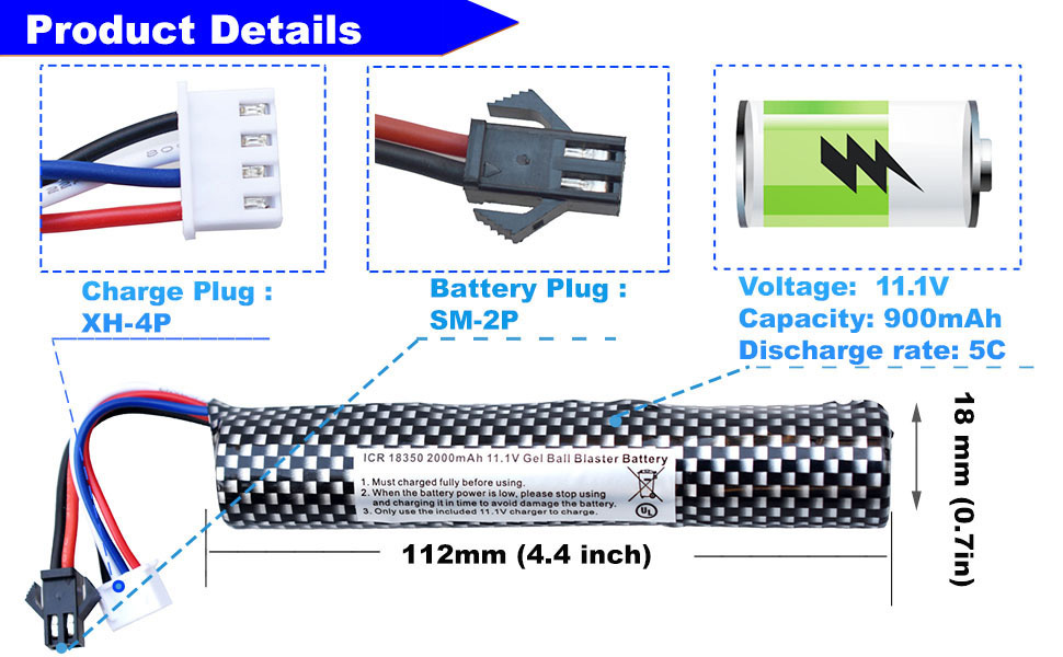 【 Important Note】: 1.Different Airsoft Gel Blaster have different battery, PLEASE CHECK THE DIMENSIONS, VOLTAGE AND PLUG MAKE SURE IT FITS YOUR DEVICE, 2.Please check the the positive & negative connector before you use,It will be dangerous if it do not fit! 3.In order to use the battery in a safe way,Please read the use manual carefully before using it. 4.Our high technology enables quick & constant charging at anytime, and no cell memory effect so that you do not need to full discharge before recharging