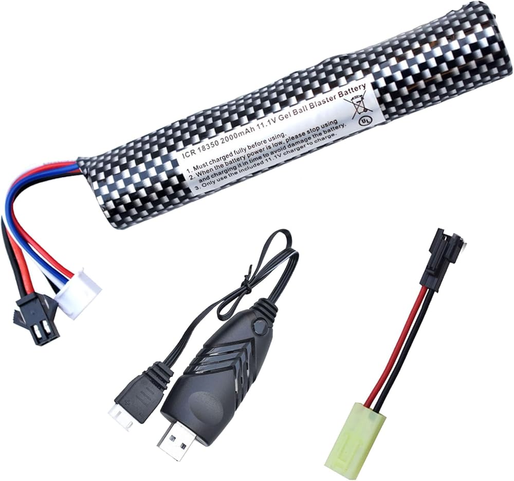 Airsoft Batteries 11.1V Gel Blaster Battery 11.1 Volt 2000mAh with Charger and SM-2P Plug to Mini Tamiya Connector Cable for Water Bead Splatter Ball(1 Pack