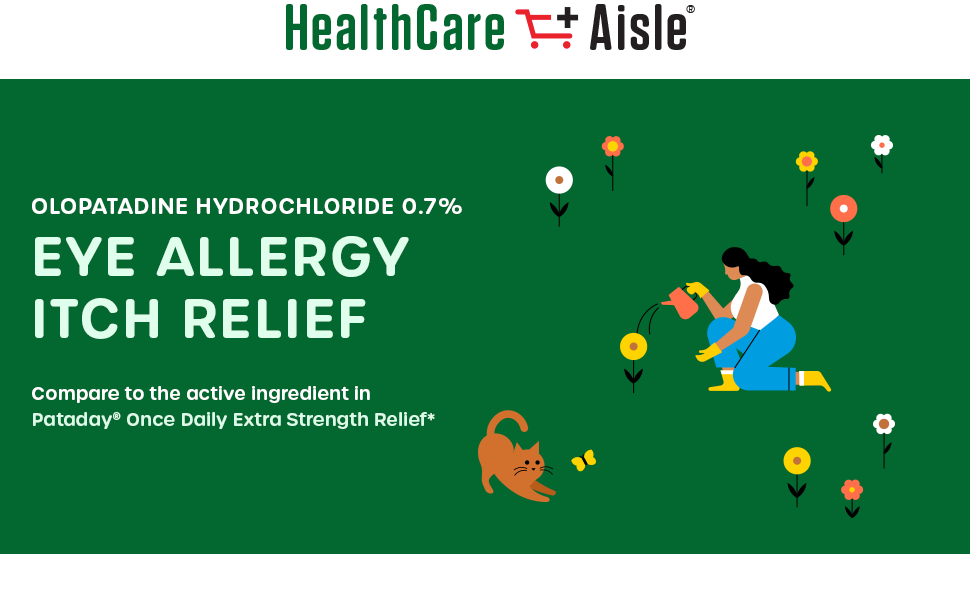 Do you suffer from itchy eyes due to allergies? Used once daily, HealthCareAisle Extra Strength Eye Allergy Itch Relief (Olopatadine Hydrochloride Ophthalmic Solution USP, 0.7%) temporarily relieves itchy eyes due to pollen, ragweed, grass, animal hair and dander. Each eye drop works in minutes; put one drop in the affected eye(s) once daily, no more than once per day. This product is not manufactured or distributed by Alcon Laboratories Inc., distributor of Pataday Once Daily Relief. Pataday is a registered trademark of Novartis AG.