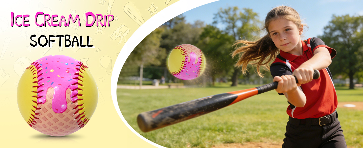 【Ice Cream Design】Includes 3 Softballs with bold melting ice cream drip details and waffle-patterned base, adding playful time to practice and games for softball players.