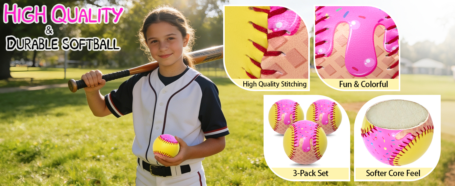 【Soft-Core Construction】Each ice cream Softball has a soft core with a durable outer coating, making it safe for beginners during throwing, catching, or batting practice.