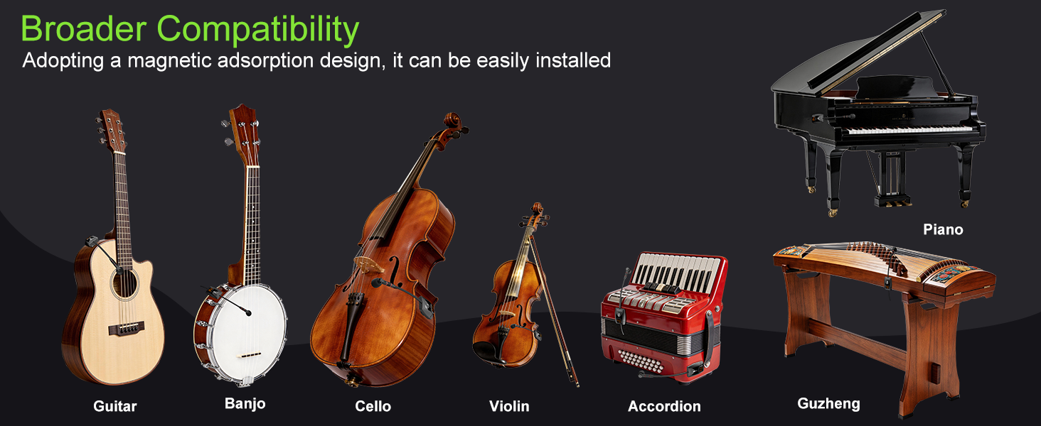 Magnetic & Stick on Dual Function : Use sturdy and traceless stickers to firmly secure the magnetic attachment in a smooth and suitable position on the surface of the instrument. The detachable and reusable magnetic attachments will not damage your instrument. The sturdy and durable magnetic clip will not slide or sag during recording, streaming, or performance.Universal multi-purpose magnetic clip are widely used in various musical instruments such as : guitar, accordion, violin, cello, banjo, piano, and so on.