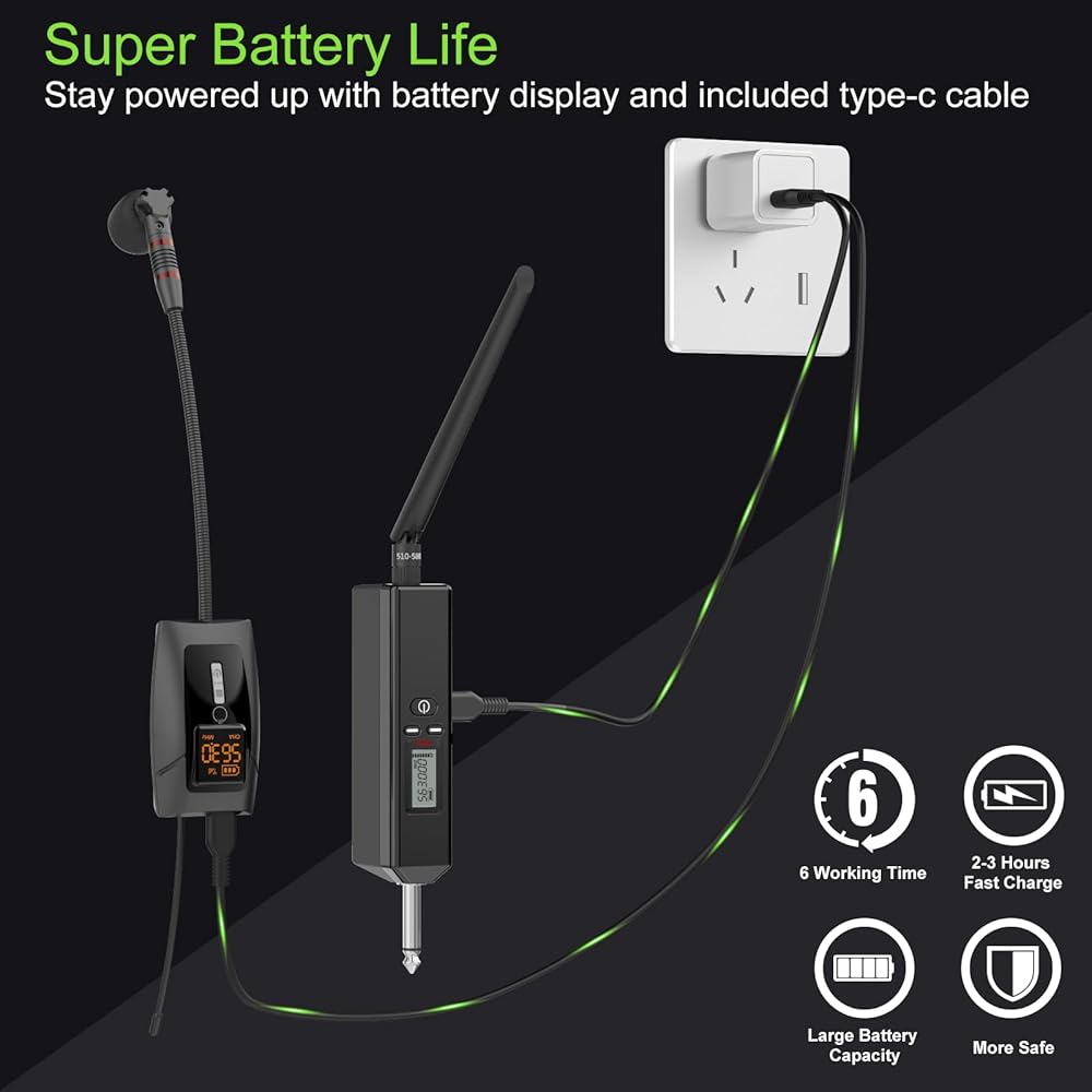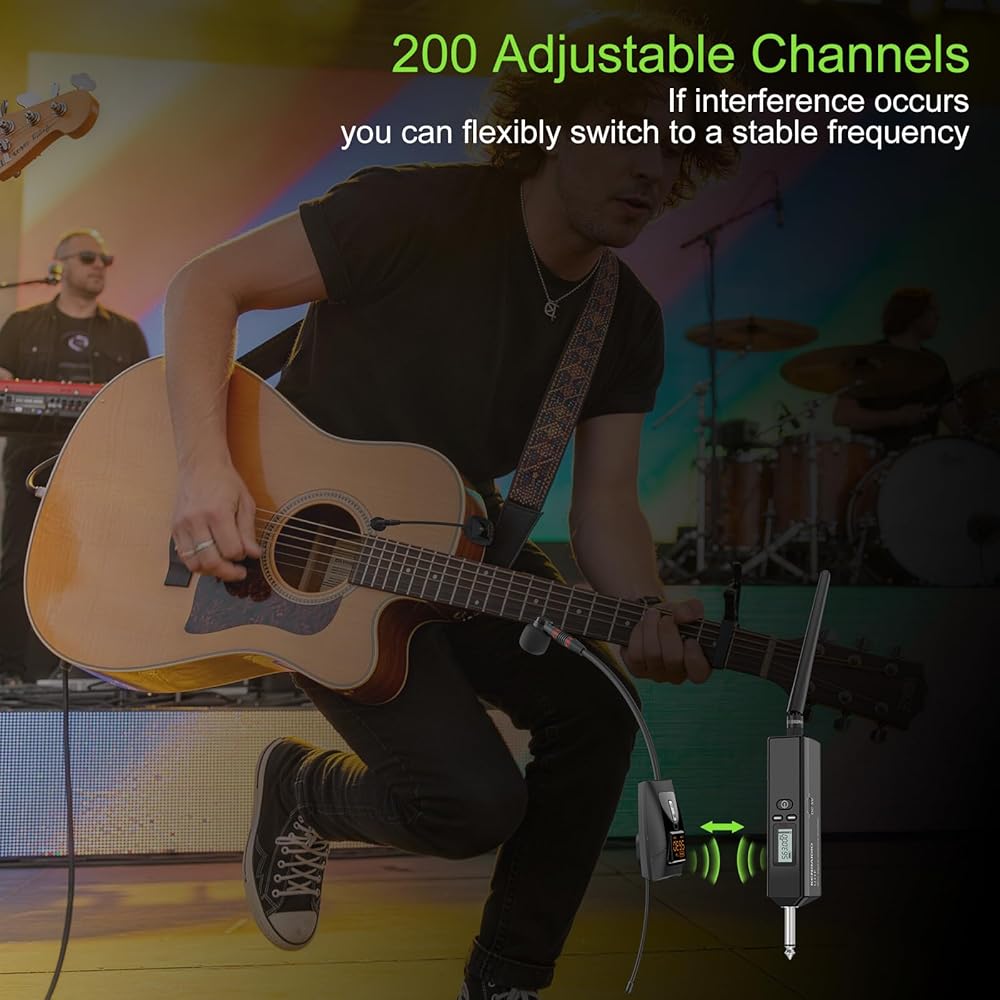 Multi-Channel Flexibility : The wireless microphone system offers 200 adjustable UHF channels (510-590MHz), ensuring stable audio transmission in complex or crowded wireless environments, preventing potential interference and supports up to more systems for use on the same occasion. Instrument mic ideal for live performances with multiple instruments or performers.