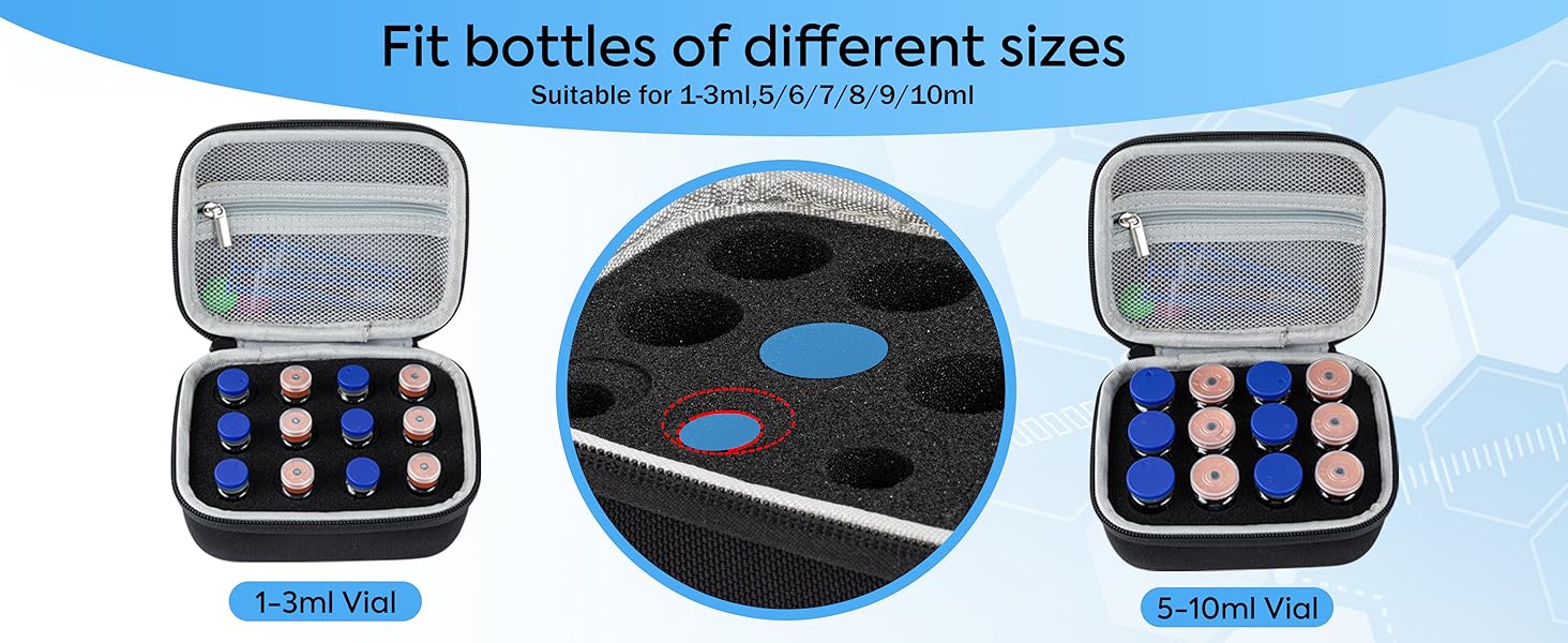 【Multi-Specification Compatibility】This insulin vial protector case can safely store up to 12 insulin bottles of 1ml,3ml,5ml,or 10ml sizes (12 compartments)