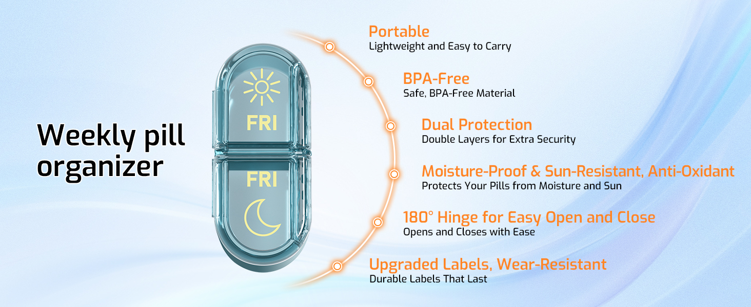 【Safe Storage, Double Protection】Crafted from BPA-free, food-grade materials, our pill organizer provides double-layer protection, keeping your pills safe from sunlight and humidity. Keep your pills fresh and effective for longer