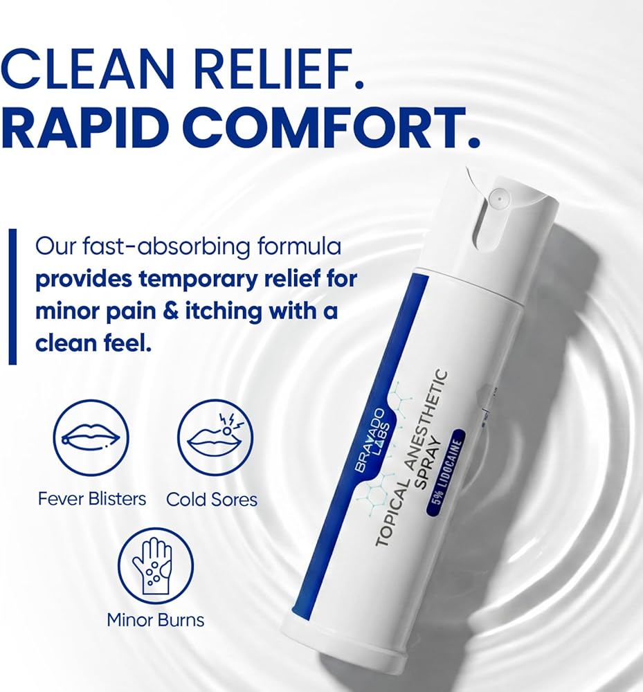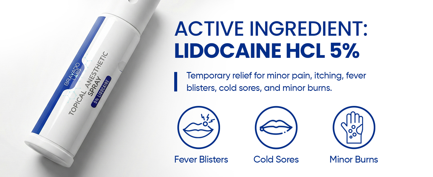 5% LIDOCAINE HCL MAXIMUM STRENGTH TOPICAL ANESTHETIC: This numbing spray, formulated with Arnica and Emu Oil to help condition skin, provides temporary relief of pain, itching and discomfort associated with burns, fever blisters and cold sores.