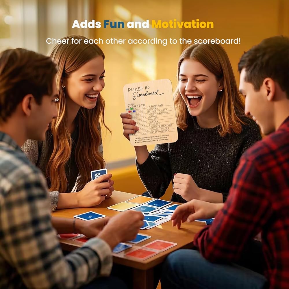 Maintaining Game Order: The phase 10 card game scoreboard keeps the game in order. It gives a clear way to track progress and ensures players know the standings. This cuts down on score related confusion and disputes, so the game can go on smoothly.