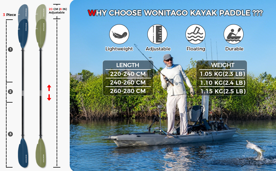 WHY CHOOSE WONITAGO --- Experience the joyful kayaking journey with your family or friends, whether you're exploring the coast, downstream along the river, or enjoying a peaceful lake, our kayak paddles are the perfect choice for your