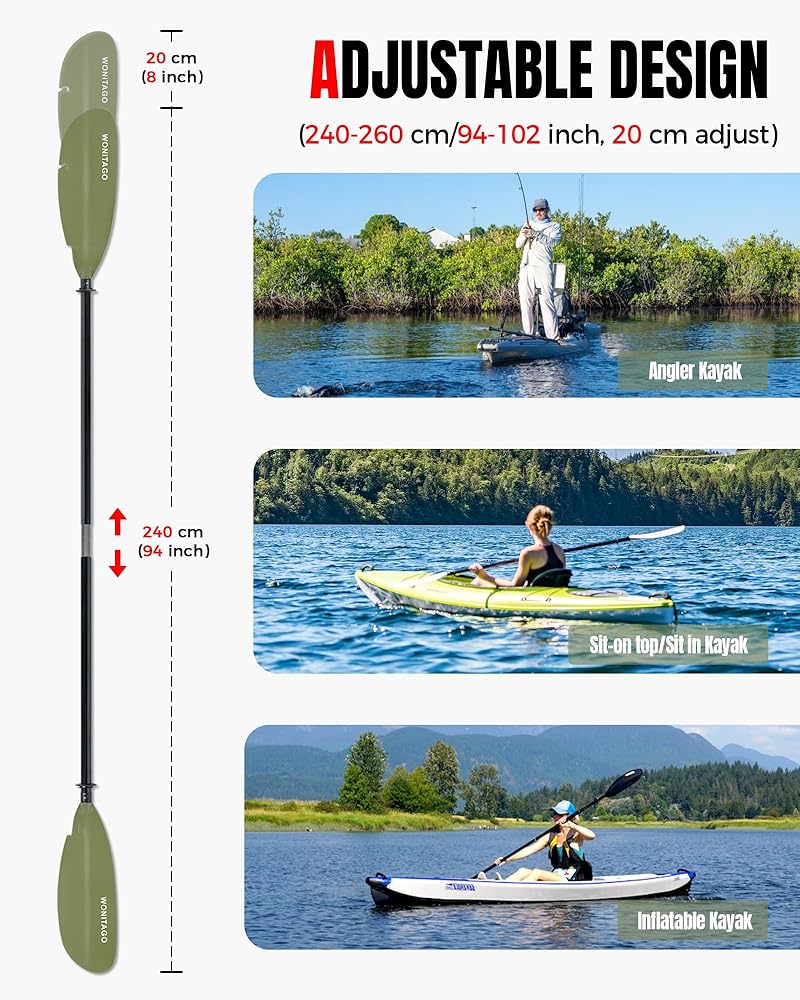 ADJUSTABLE KAYAK PADDLES --- The total length is 94"-102"/240-260 cm, 20 cm adjustable. Total weight is only 2.4 lbs (1.1 kg). Suitable for most types of kayaks and paddlers