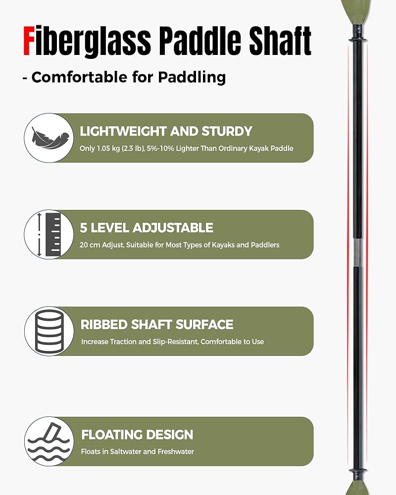 FIBERGLASS KAYAK PADDLE --- Crafted from the premium fiberglass shaft, compared to traditional aluminum shaft, it's lightweight and durable, allowing you to achieve better speed and control on the water