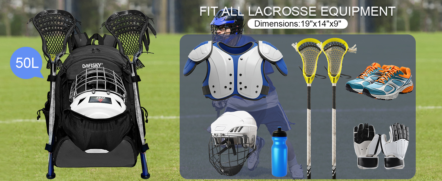 40L Large Capacity: This lacrosse bag measures 14 x 9 x 19 inches and features dedicated compartments to organize your sticks, full set of protective gear, helmet, gloves, ball, and shoes.