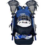 This professional lacrosse backpack is designed for field sports. The main compartment is intended for clothing and protective gear, organizing items such as a helmet, shoulder pads, arm guards, gloves, and goggles. Two adjustable hook-and-loop straps on the side securely hold lacrosse sticks in place. A dedicated internal storage section keeps lacrosse balls contained and accessible. A fully isolated and vented shoe compartment separates cleats or turf shoes from other contents. Additional external straps provide the option to carry a helmet on the outside of the bag. The construction utilizes durable, water-resistant polyester fabric with reinforced stitching. The carrying system includes padded shoulder straps, an adjustable sternum strap, and a ventilated back panel. With its organization focused on gear management, this lacrosse backpack also functions as a field hockey bag and is suitable for sports like football and baseball.
