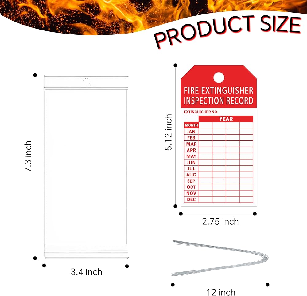 Complete Package:You will get 50 pieces of 3.4 x 7.3 inch transparent fire extinguisher inspection tag covers 50 pieces of 12 inch galvanized iron wires and 50 pieces of 2.75 x 5.12 inch 200g copperplate paper fire extinguisher tags The transparent PVC material makes the inspection tag clearly visible inside the cover Suitable for both indoor and outdoor use