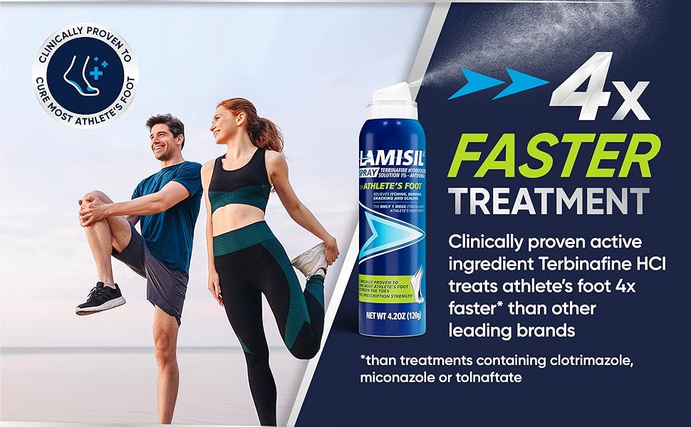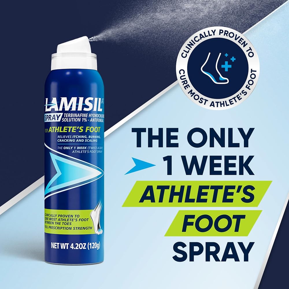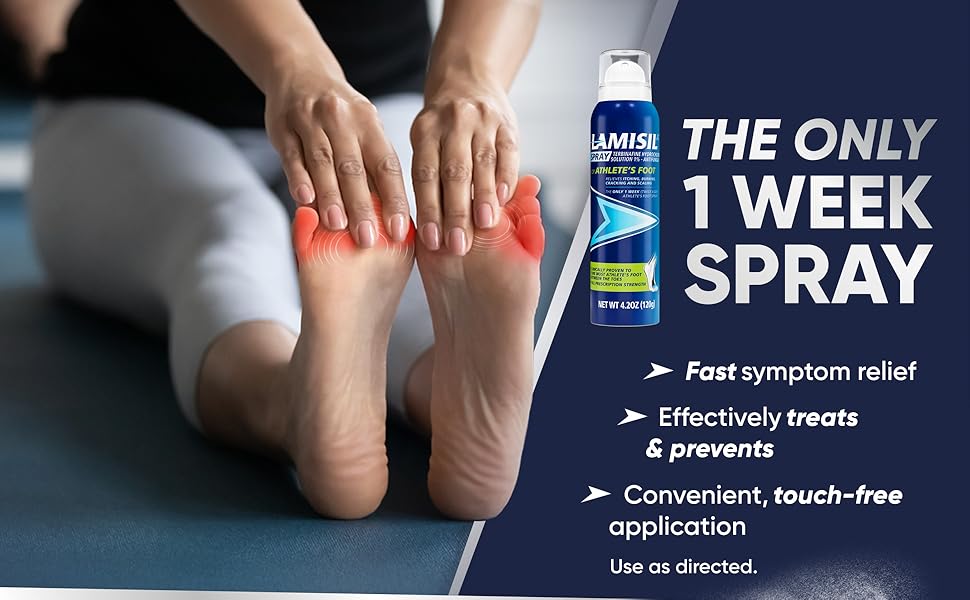 ELIMINATE ATHLETE'S FOOT FAST & STOP THE SPREAD: Lamisil Athlete's Foot Spray is the ONLY 1 week Antifungal Spray to cure most Athlete's Foot between the toes. Don't let athlete's foot spread to other areas of your foot, lead to nail fungus, or affect other parts of your body. Treat Athlete's Foot fast with the #1 Doctor Recommended antifungal brand. Powerful, prescription-strength Terbinafine Hydrochloride 1% actively targets and kills the tinea pedis fungus, providing fast relief from itching, burning, redness, cracking, and scaling. PREVENT FUTURE OUTBREAKS: Not only does Lamisil relieve symptoms, but it also prevents recurrence for up to 2 months, for long-lasting protection and relief. Trusted by doctors and millions of users, Lamisil offers effective treatment to stop the spread of fungal infections and keep your feet healthy. TRUSTED BY DOCTORS & EFFECTIVE FOR ACTIVE LIFESTYLES: Lamisil is a top choice for athletes and active individuals, delivering reliable and rapid results. Its easy-to-use continuous touch-free spray helps you apply in hard-to-reach places and avoid touching the fungal infection. SAFE FOR INDIVIDUALS 12 AND OVER: Lamisil is safe and effective for adults and teens aged 12 and older, providing fast, reliable treatment for athlete's foot. Whether you're managing a busy lifestyle or recovering from a fungal infection, Lamisil offers a trusted solution for the family.