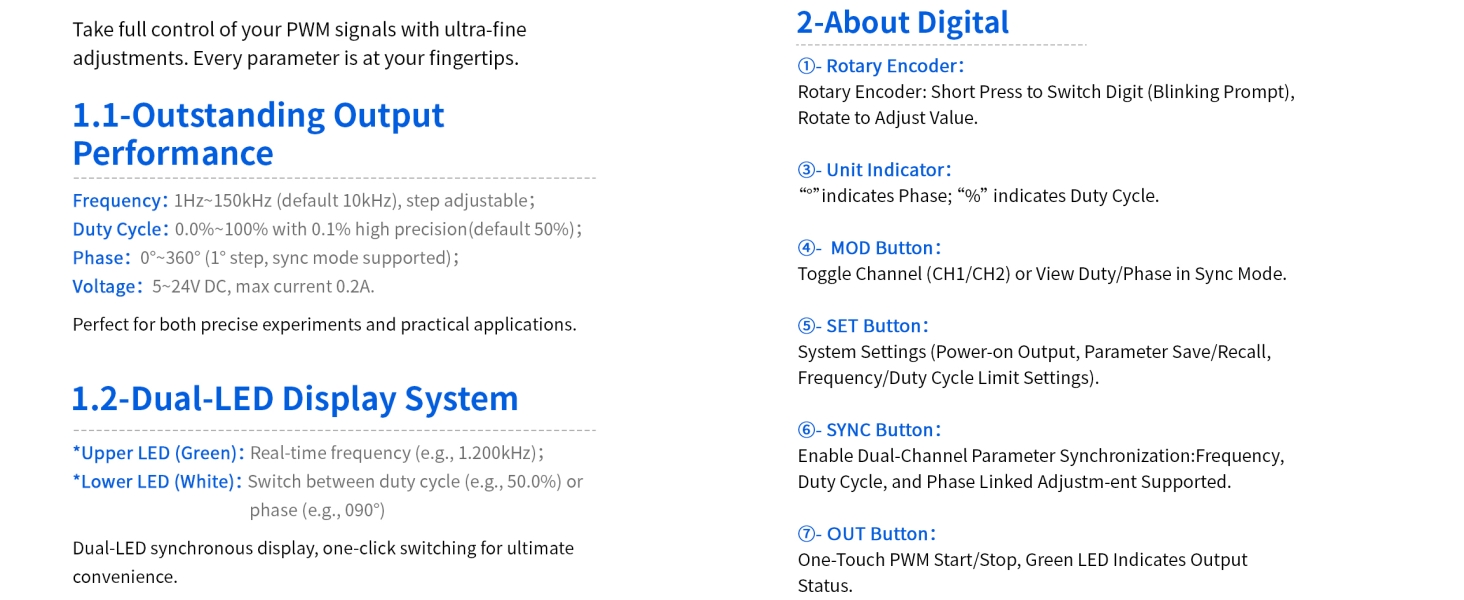 Parameter:working voltage range DC 5V-24V; frequency range 1Hz-150kHz; output current 0.2A Max; Duty cycle accuracy 0%-100% Step adjustment 0.1%;Phase adjustment 0 °~360 °(1 ° step, synchronous mode available)