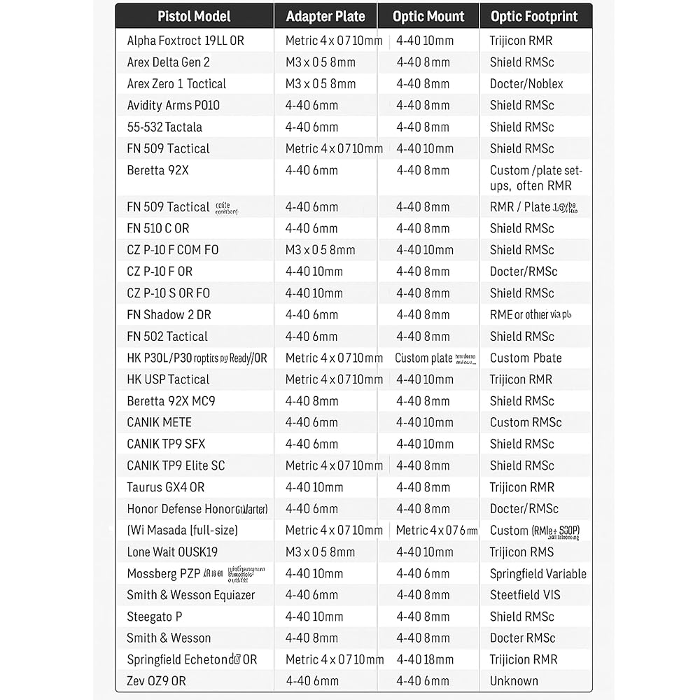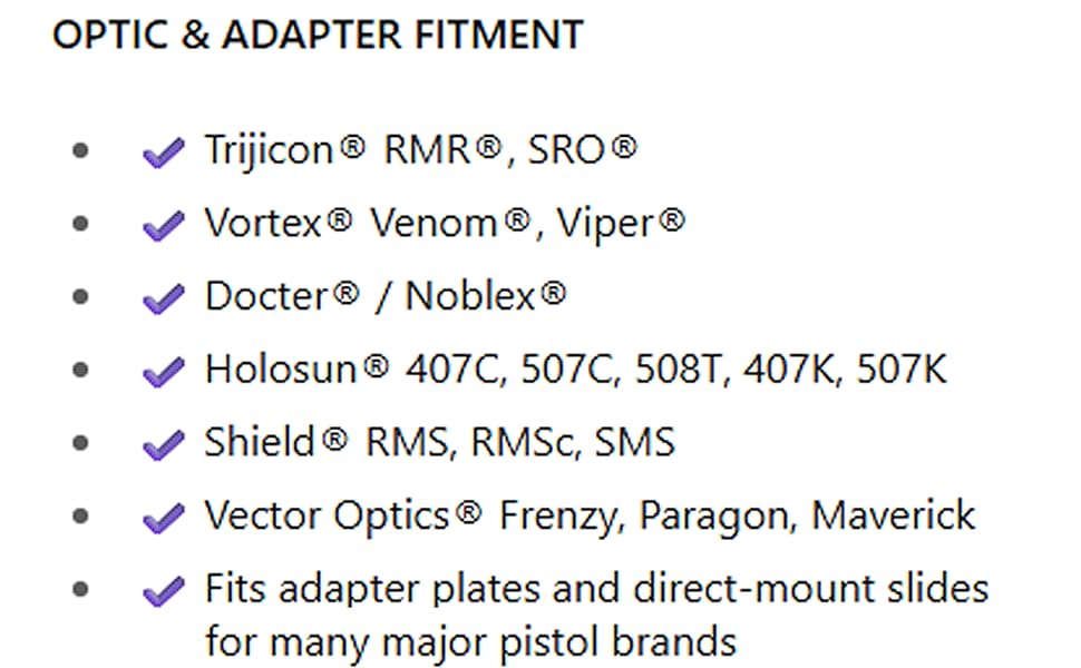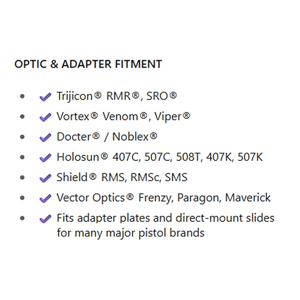 Compatible Optics: Fits leading red dot brands and footprints including Trijicon RMR, SRO, Holosun 407C/507C/508T/407K/507K/507COMP, Vortex Venom & Viper, Leupold DeltaPoint Pro, Shield RMS/RMSc/SMS, Aimpoint ACRO, Docter / Noblex, Vector Optics Frenzy/Paragon/Maverick, AmeriGlo Haven, Liberty/Justice, Primary Arms Mini Reflex, Riton X3 Tactix PRD, ADE RD3 Series, and many others.