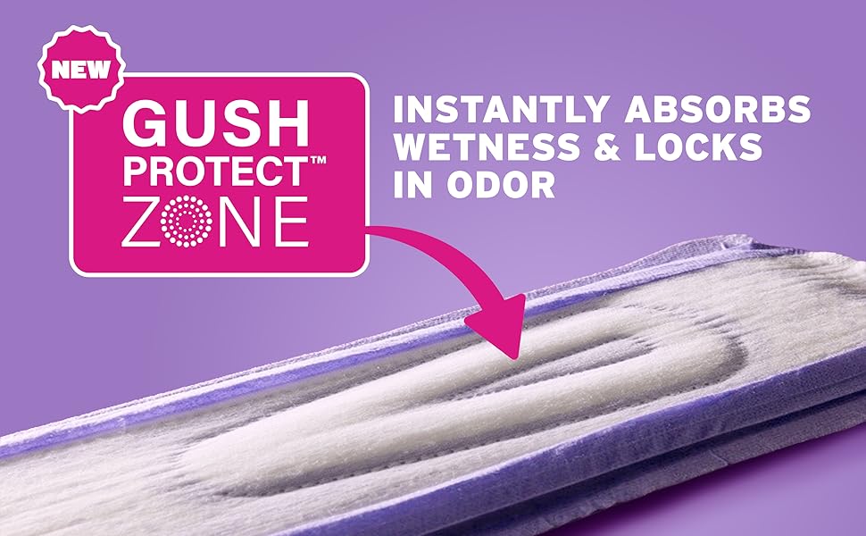 NEW! GUSHPROTECT ZONE — Instantly absorbs wetness and locks in odor for bladder leak protection