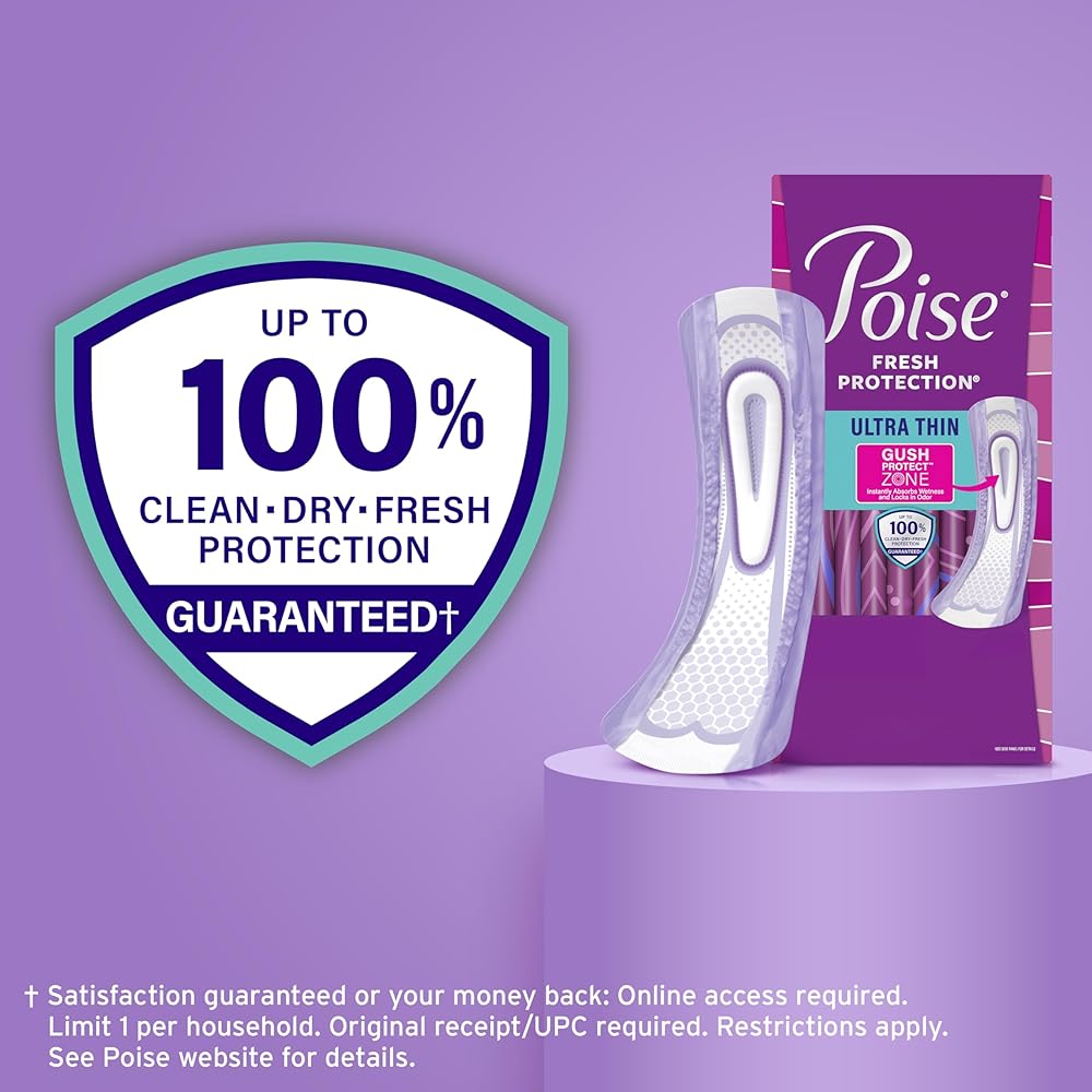 Poise Ultra Thin Incontinence Pads for Women provide powerful, discreet protection against bladder leaks and now deliver improved performance with the NEW GushProtect Zone that instantly absorbs wetness and locks in odor. The GushProtect instantly pulls in liquid without the bulk*. The Dry-Touch layer locks away more wetness than the leading period pad for a clean feel. They provide up to 12-hour odor control to help you feel fresh all day. Each women's incontinence pad is thin and soft, and designed for bladder leak protection that is discreet and comfortable. With Poise, you get up to 100% clean, dry, and fresh protection guaranteed**. Poise incontinence and postpartum pads for bladder leaks are available in multiple absorbencies: 3 Drop (Light), 4 Drop (Moderate), 5 Drop (Maximum), 6 Drop (Ultimate), 7 Drop (UItra), and 8 Drop (Overnight) so you can find the right fit for your unique needs. Packaging may vary. (*vs. leading bladder leak pad) (**Buy by 12/31/26; requests must be postmarked w/in 30 days of purchase. Online access & orig. receipt/UPC req'd. Limit 1/household. Restrictions apply. Details at Poise website)