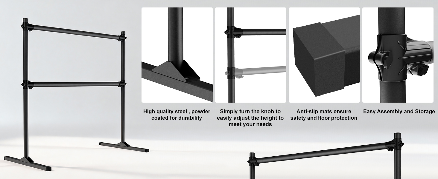 Adjustable Height: This portable ballet barre comes with two 4 ft bars that are adjustable in height from bottom to the top 49". You can easily adjust the height to meet your needs with a simple turn of the knob.