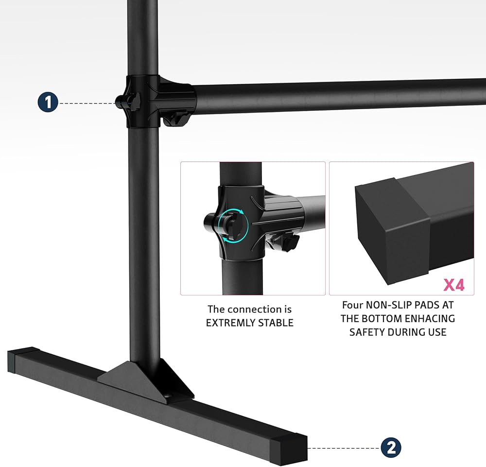 High-quality materials: The ballet barre is crafted from premium tubing with a powder-coated finish and high-grade fasteners, supporting up to 350 lbs. Equipped with non-slip rubber feet, it ensures stability during stretching and core strengthening exercises.