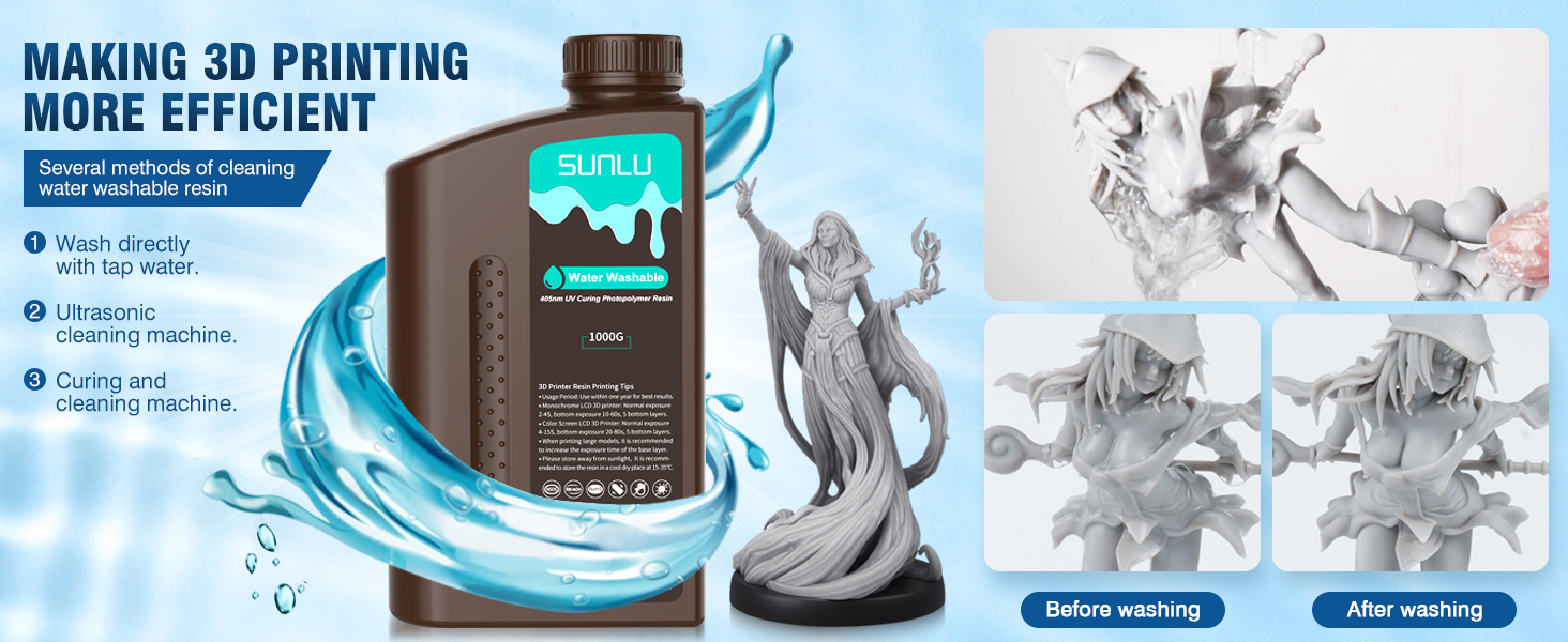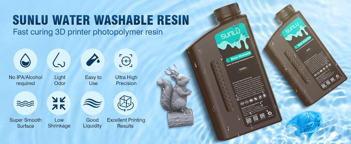 ①【SUNLU Water Washable Resin】SUNLU fast curing 3D printer water washable photopolymer resin, it can be directly cleaned with water instead of IPA/alcohol, easy to clean, save time and more economics.
