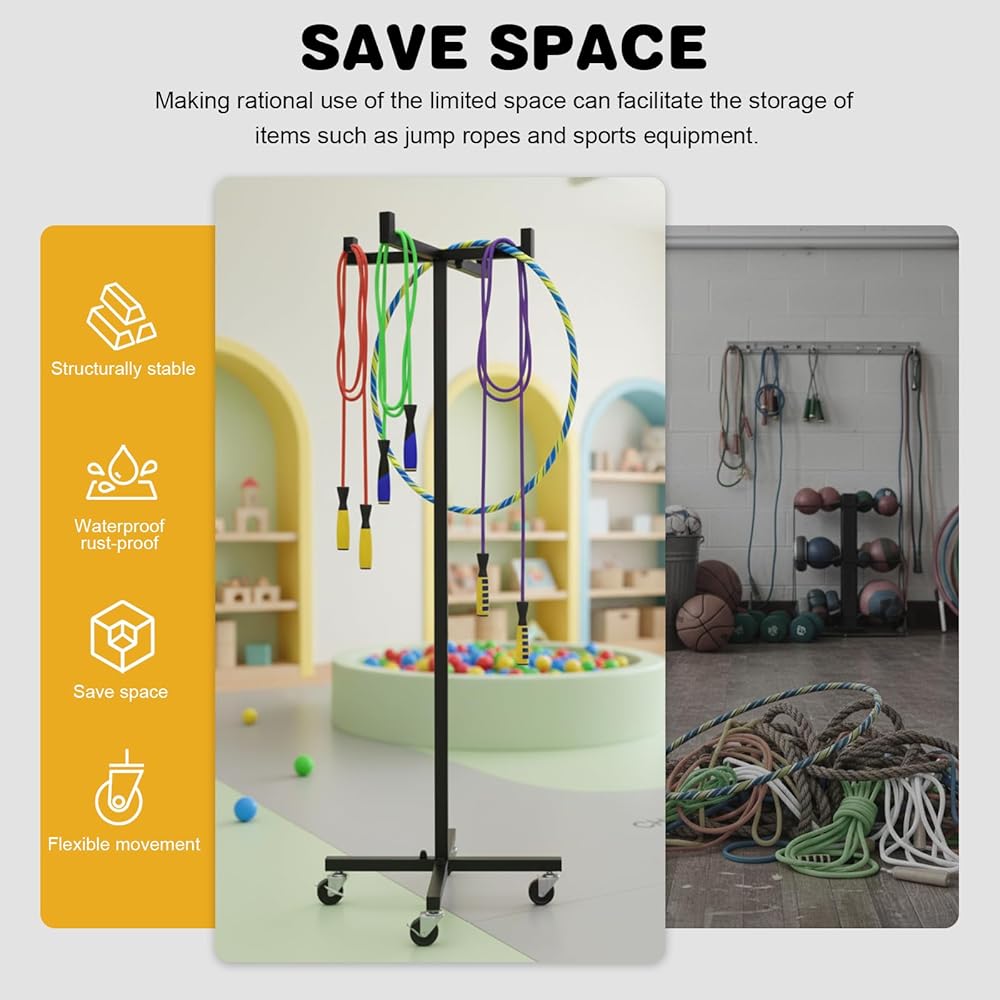 Easy Mobility Rack: With the mobile jump rope tree rack, moving and storing your exercise equipment becomes hassle-free. Its smooth-rolling design lets you transport ropes and hoops between rooms or locations, providing flexibility for fitness classes or sports activities.