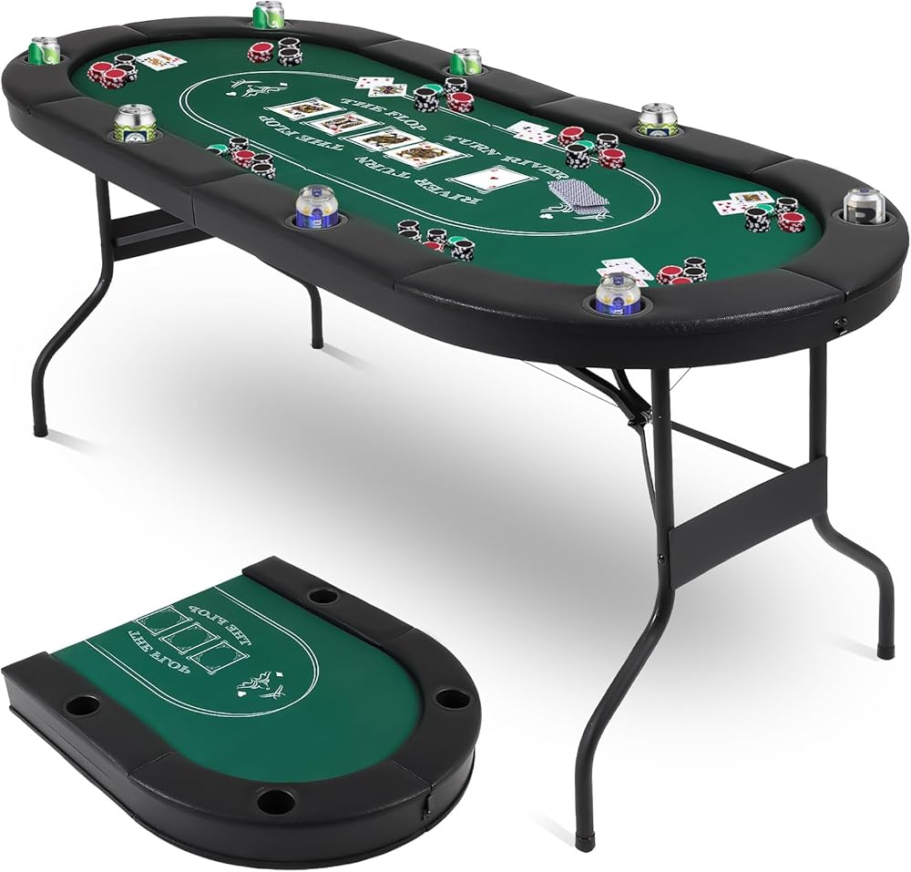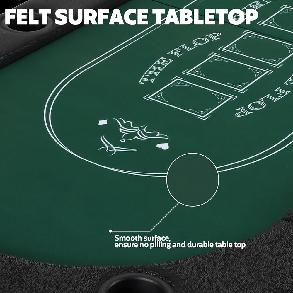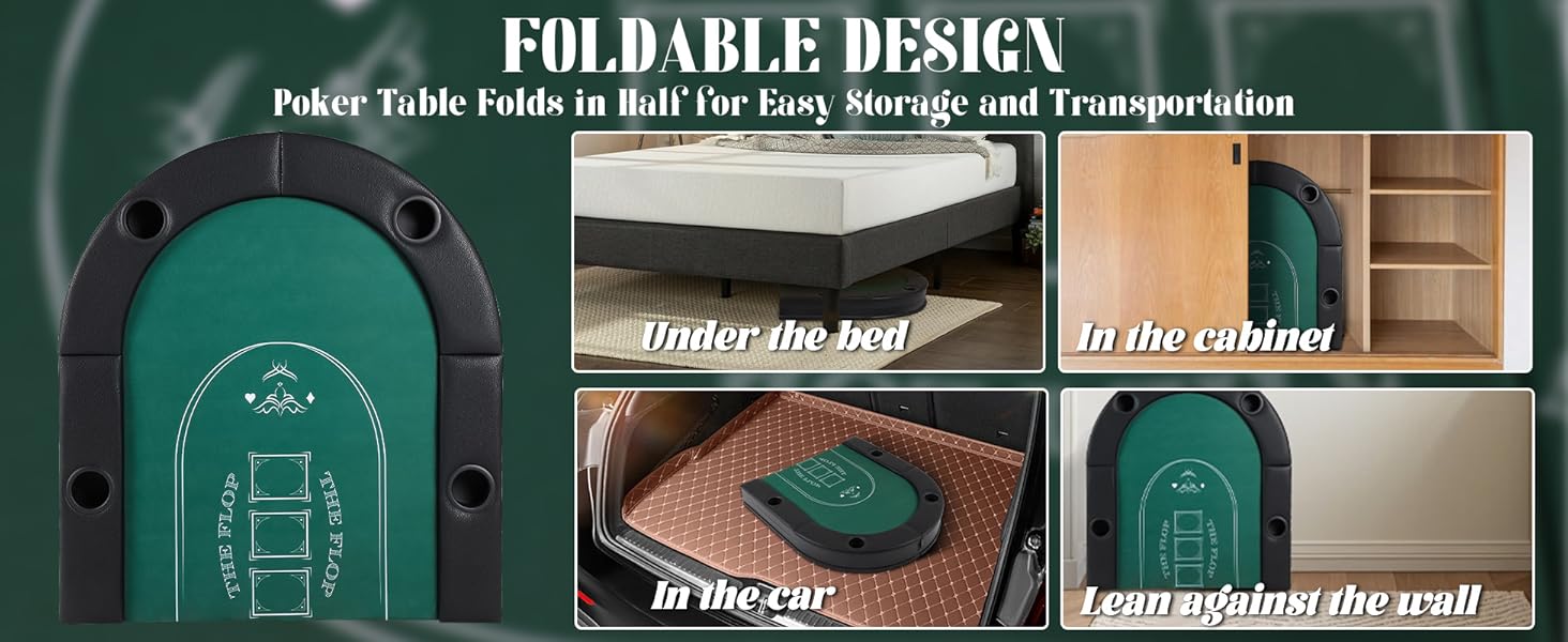 Foldable Design: The foldable design of the portable Poker Table reduces installation time, allowing you to experience the game faster after receiving the Poker Table. Foldable design for compact portability and easy storage. When not in use, the Poker Table can be folded up for easy storage to save space.