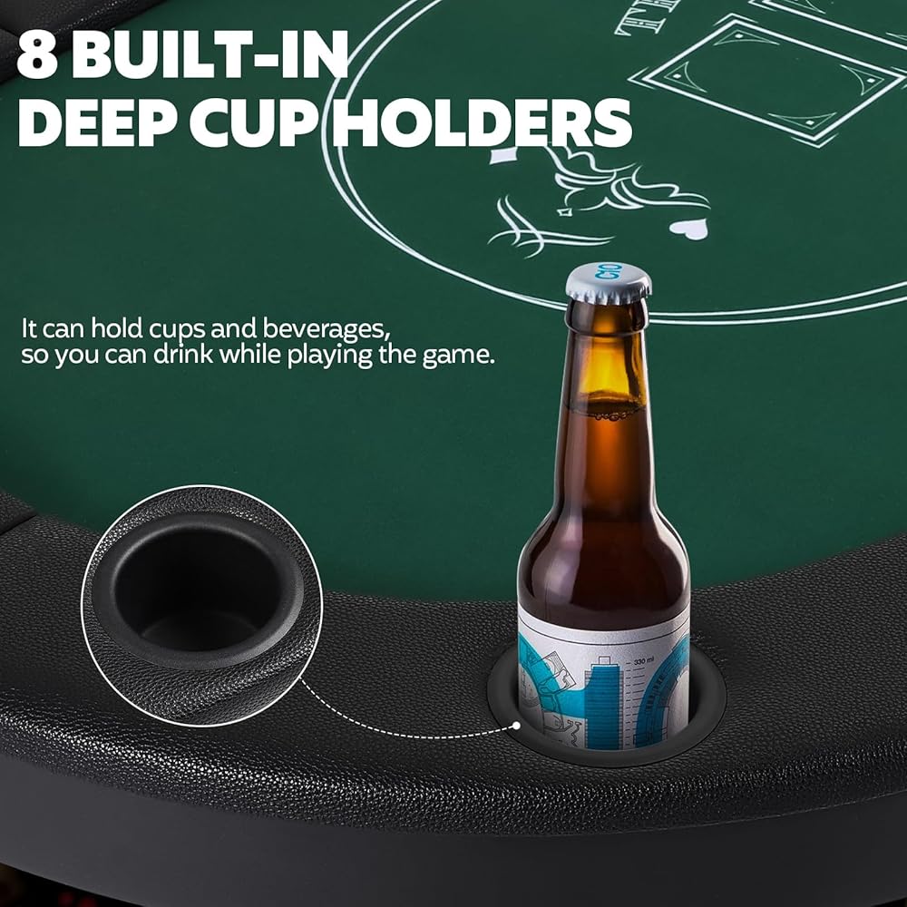 Practical Designs: The Poker Table top is made of casino-grade felt surface, which is comfortable to touch, giving you a better gaming experience. The Foldable Poker Table is designed with cup holders, allowing for safer placement of beer bottles or any cups in the cup holders, ensuring that you can enjoy cool drinks while playing exciting poker games.
